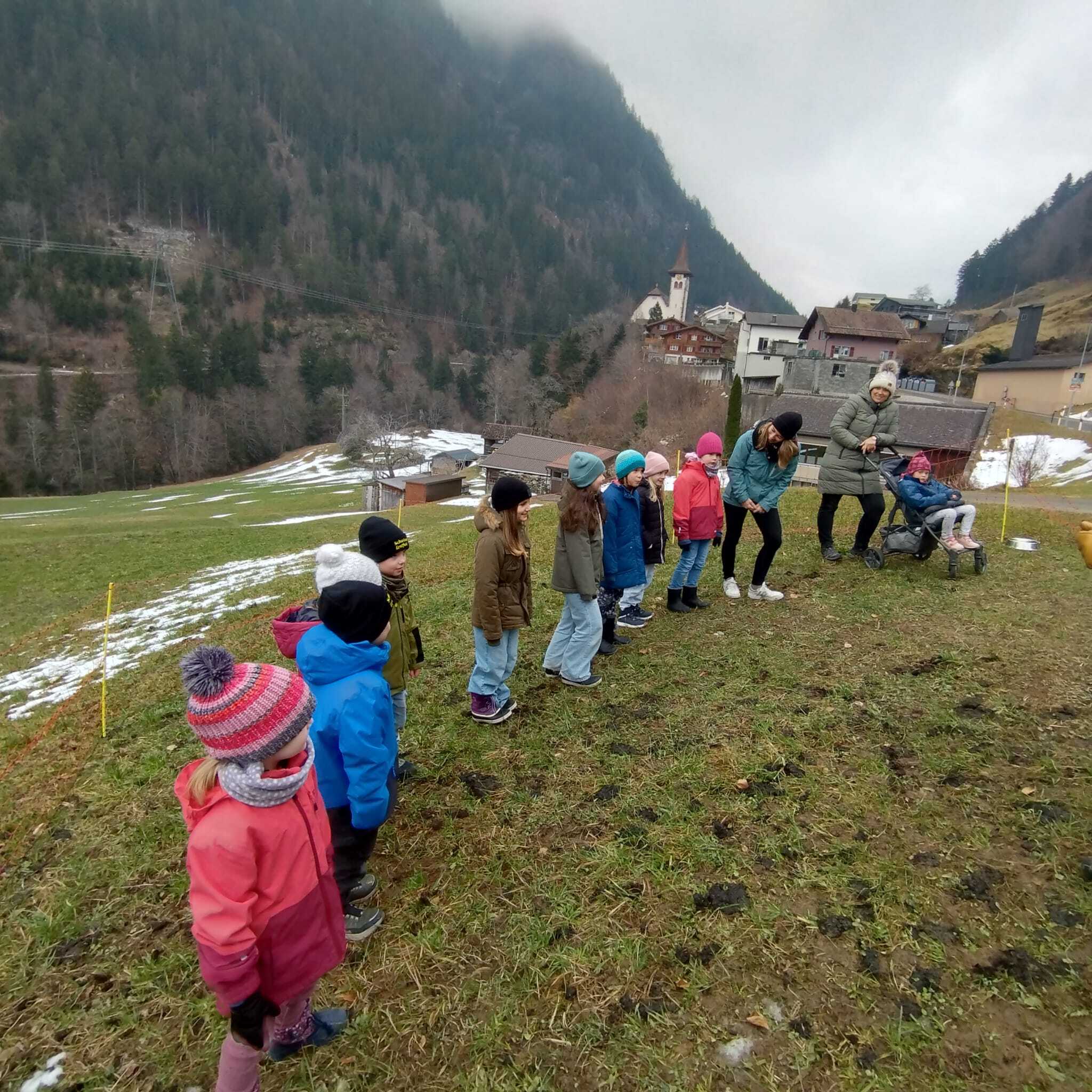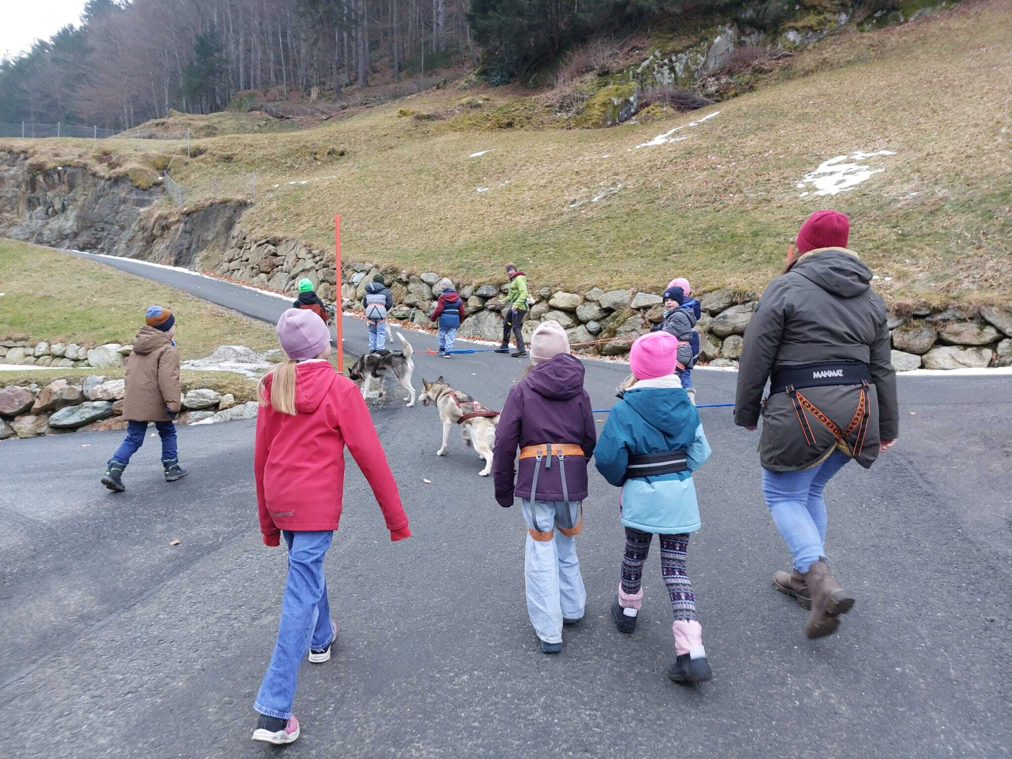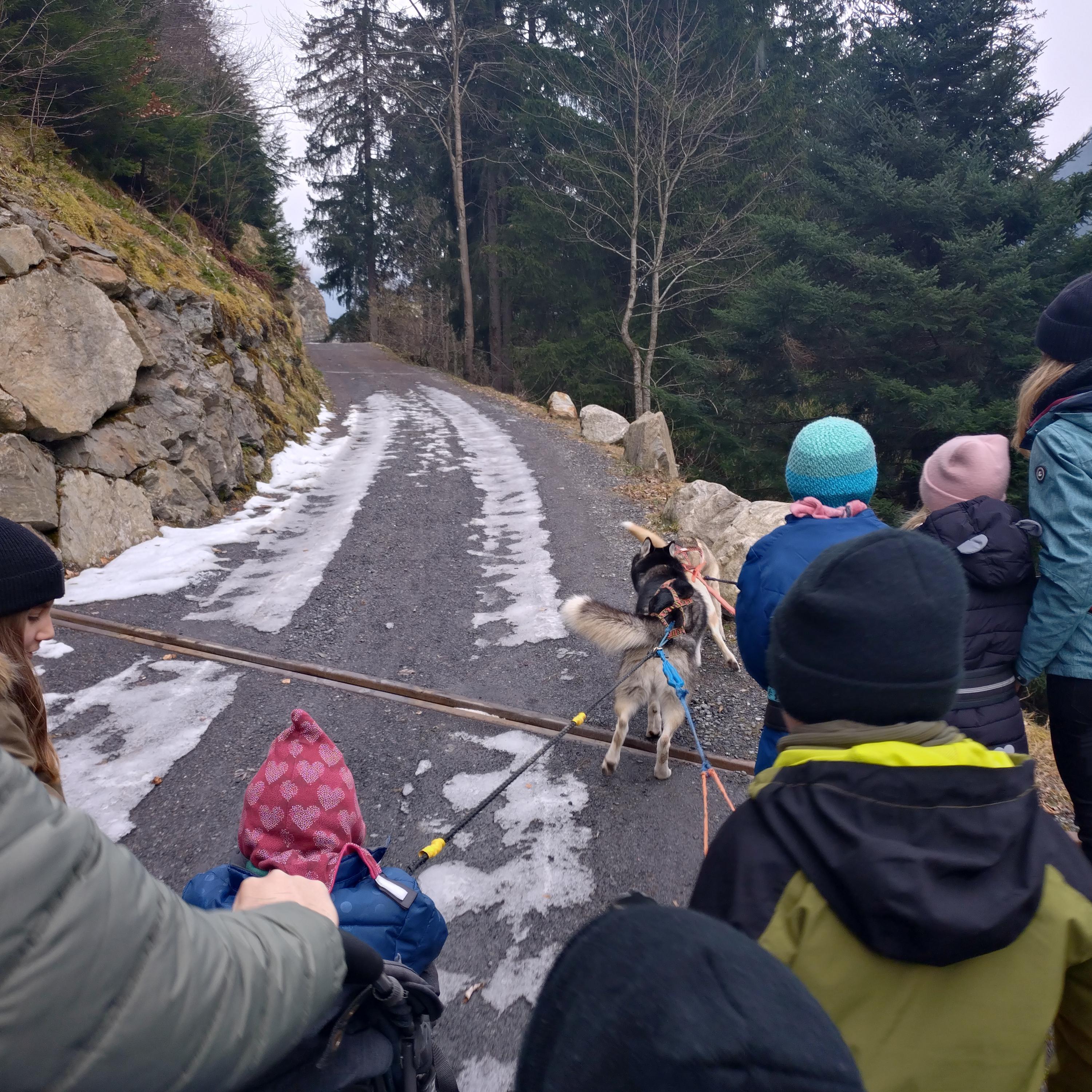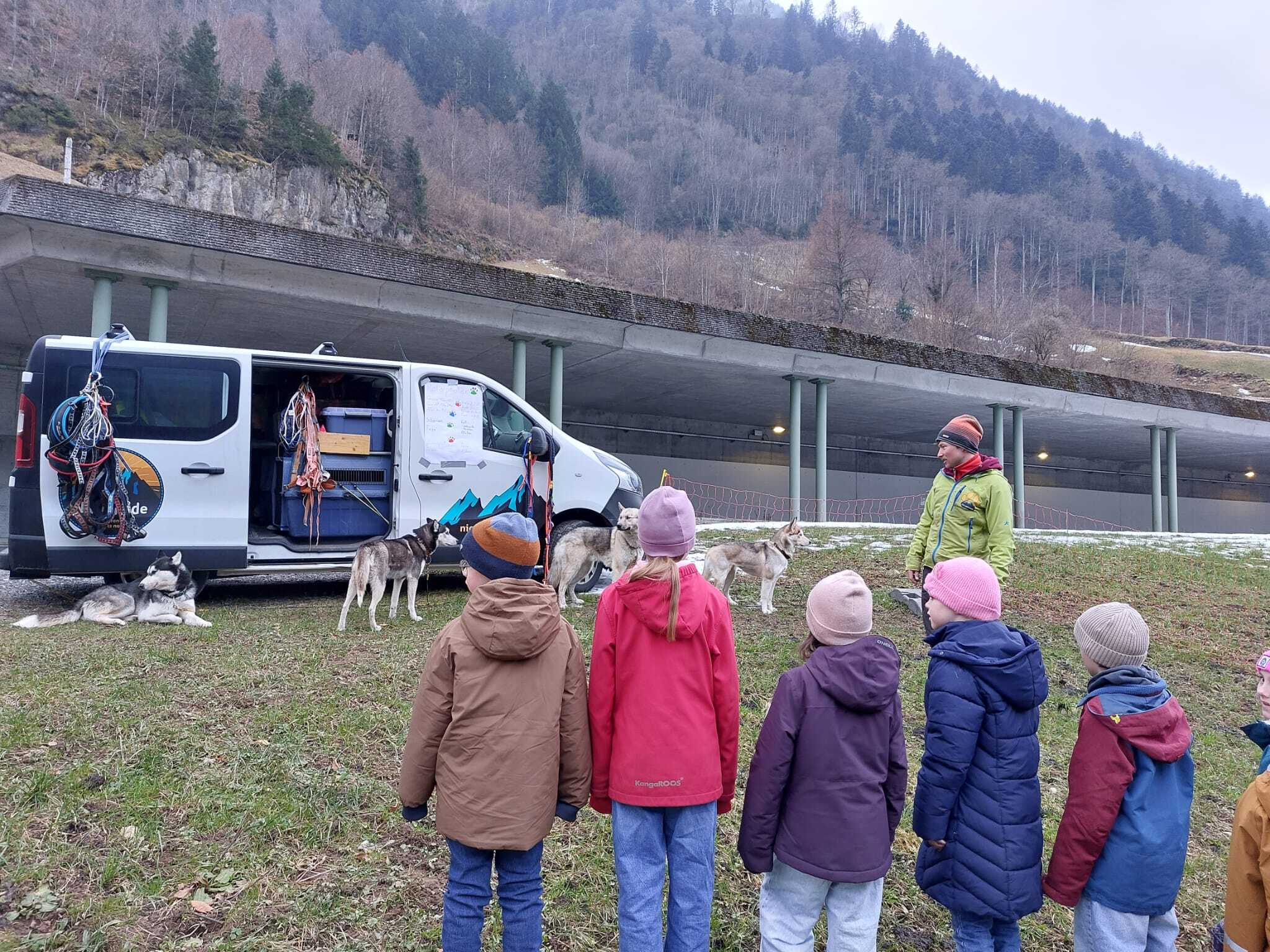 Am Mittwoch, 28. Januar 2026 erhielten wir Besuch von «Polarpfoten». Nicolas Forrer und seine vier Huskys Nala, Balou, Rhodos und Tani kamen nach Bristen. Die Basisstufenkinder wurden in zwei Gruppen geteilt, eine Gruppe durfte vor der Pause bei den Huskys sein, die andere Gruppe nach der Pause. Als erstes erzählte uns Nicolas viel Spannendes über die Huskys. Danach zogen die Hunde und auch wir ein «Gstältli» an und ein Hund wurde an 2-3 Kinder mit einem Erwachsenen angeleint. Der Spaziergang hat uns allen viel Spass gemacht und wir waren überrascht, wie stark die Hunde ziehen. Wieder zurück erhielten die Hunde noch eine kleine Belohnung und wir durften die Hunde noch kämmen. Voller Freude verabschiedeten wir uns von Nicolas und den Hunden.